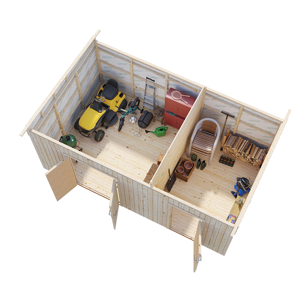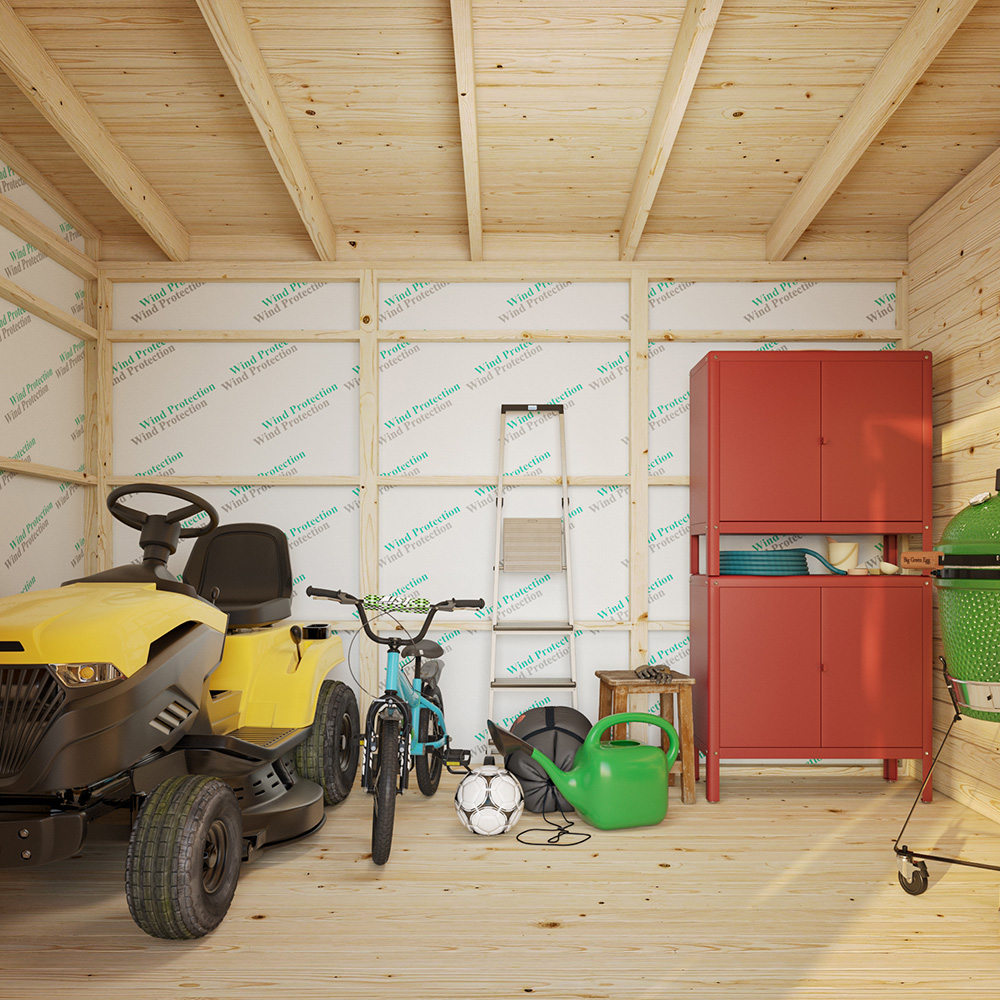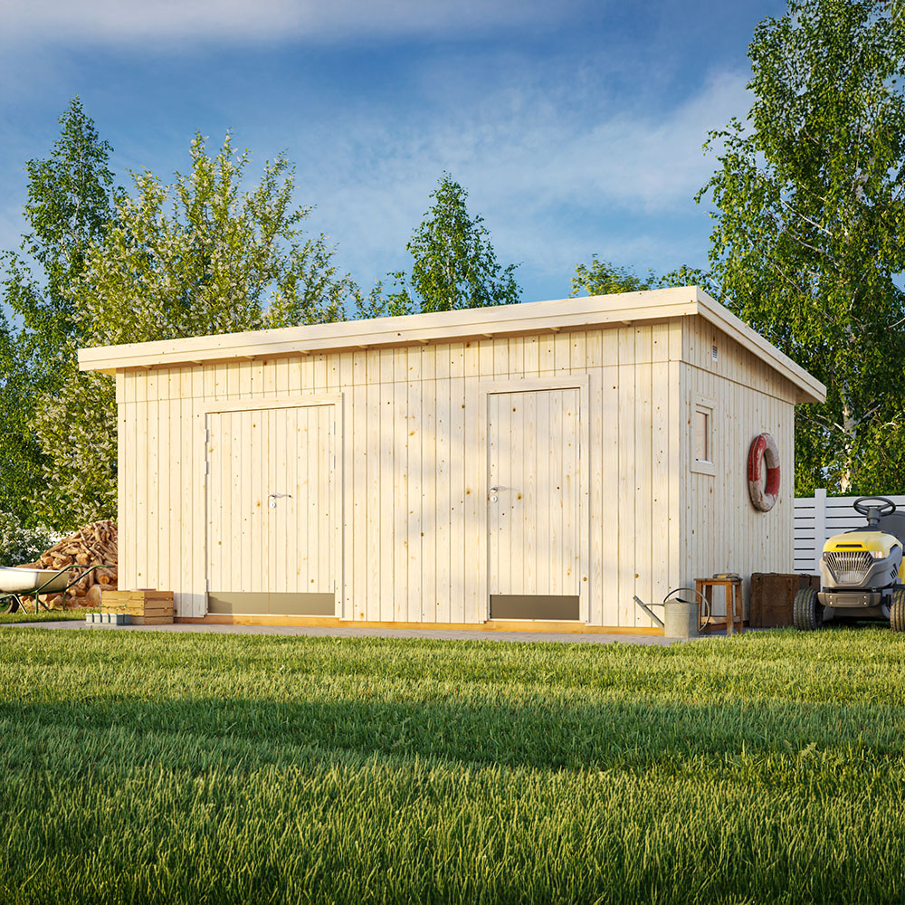 Modernt förråd med färdiga väggelement som invändigt är klädda med vindskyddsfolie, vilket gör det väldigt väderbeständigt. Modellen innehåller ett komplett set av fönster-/dörr- och väggelement som kan placeras på olika sätt. Enkel konstruktion möjliggör snabb och enkel montering.