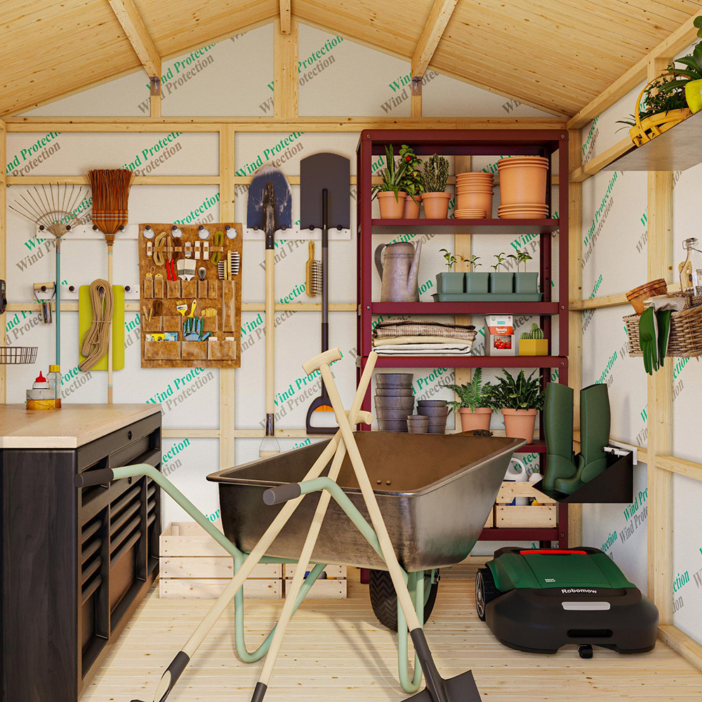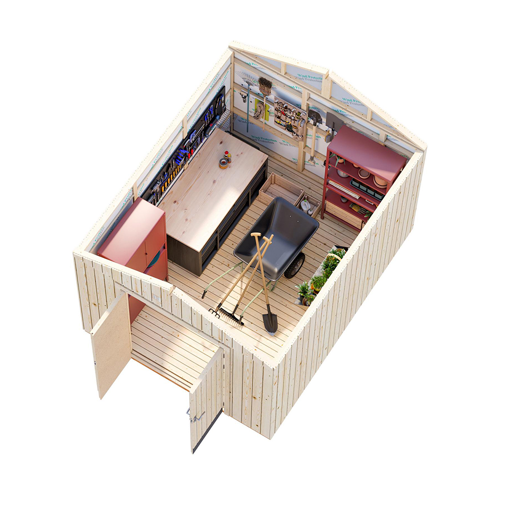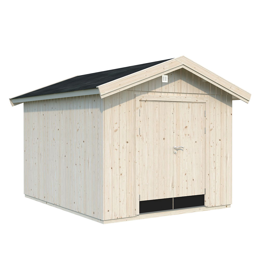 Modernt förråd med färdiga väggelement som invändigt är klädda med vindskyddsfolie, vilket gör det väldigt väderbeständigt. Modellen innehåller ett komplett set av dörr- och väggelement. Enkel konstruktion möjliggör snabb och enkel montering.