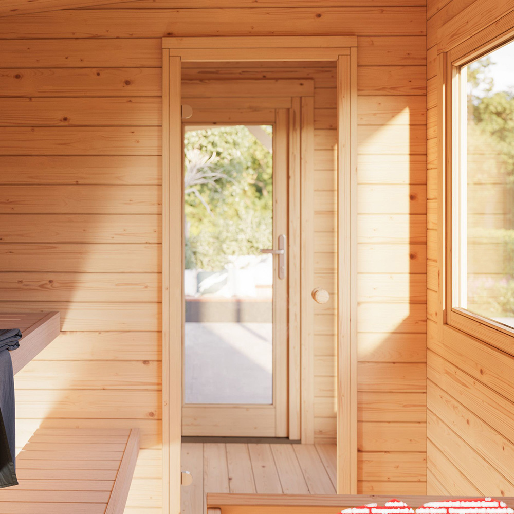 Med en bastudel på 6,8 m2 kan du njuta av en traditionell bastuupplevelse av hög kvalitet, perfekt för avkoppling och välbefinnande. Entrén är perfekt för ombyte innan och efter bastubadet. Den ger också en bekväm plats för att hänga upp blöta handdukar och hålla basturummet rent och snyggt.