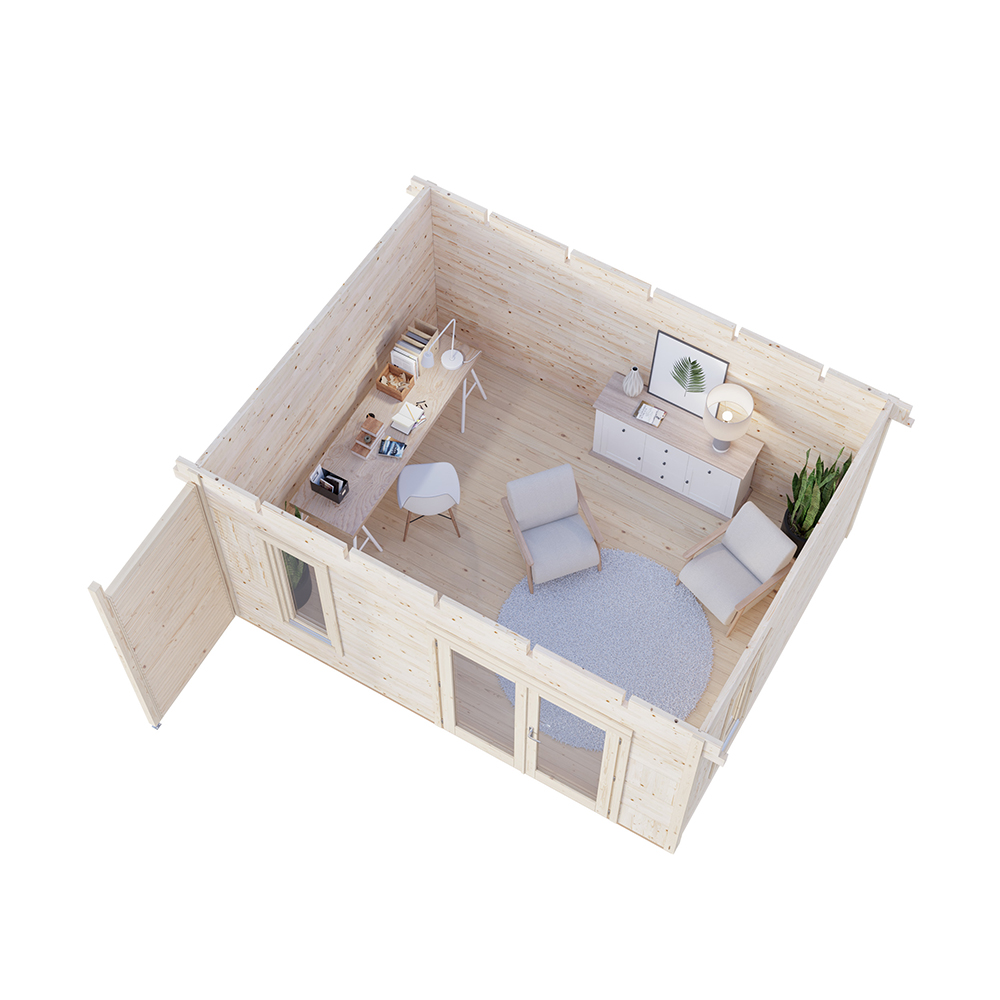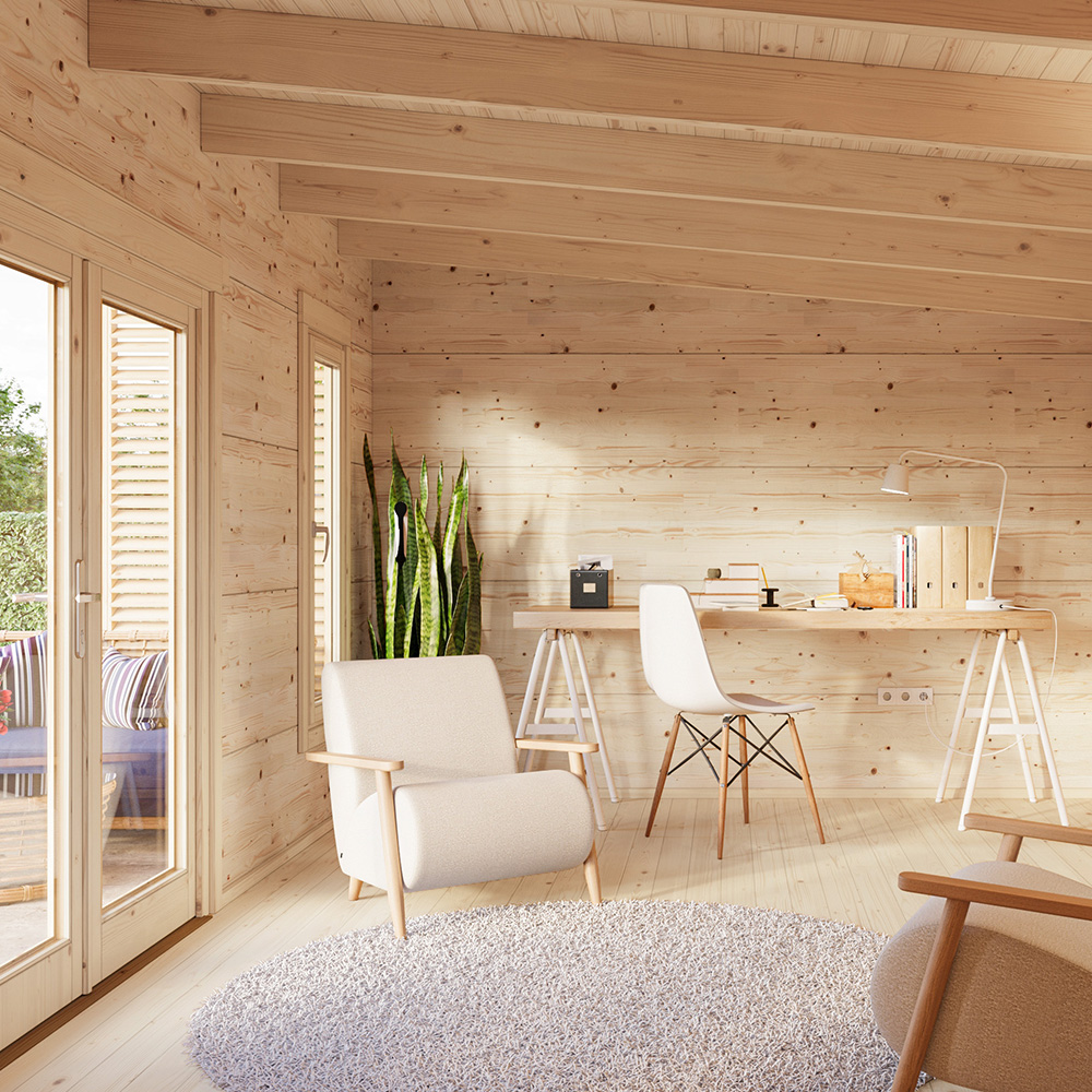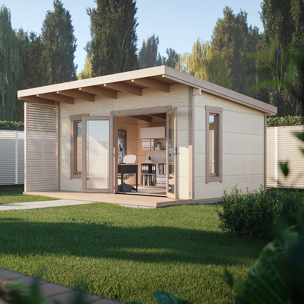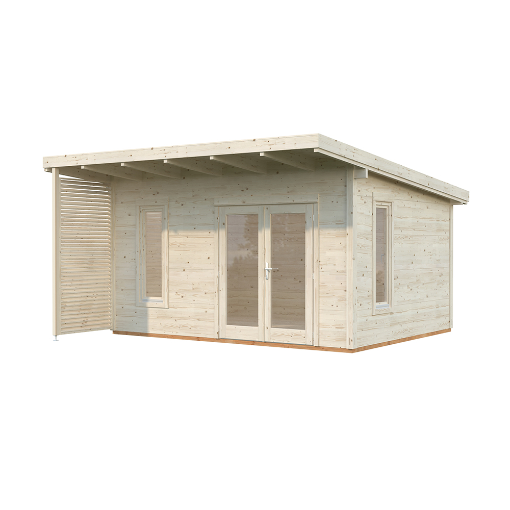 Grace har en massiv träkonstruktion som gör den till ett tåligt och stabilt tillskott i din trädgård. Här finns plats för både extra sängar för gästerna såväl som skrivbord för ditt hemarbete. Den snygga skärmen ger insynsskydd och skugga till den lilla uteplatsen under tak. Här kan dina gäster avnjuta dagens första kaffe efter en god natts sömn. Slå upp de stora glasdörrarna så suddas gränsen mellan ute och inne ut.