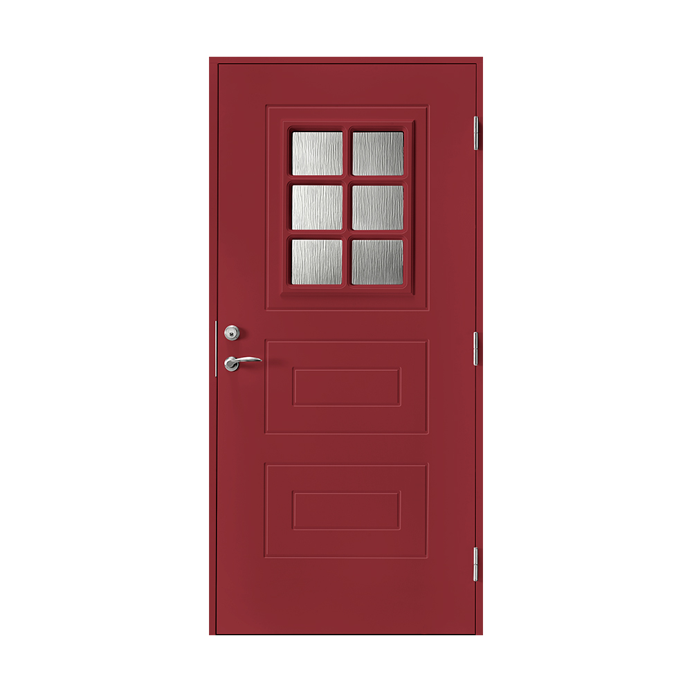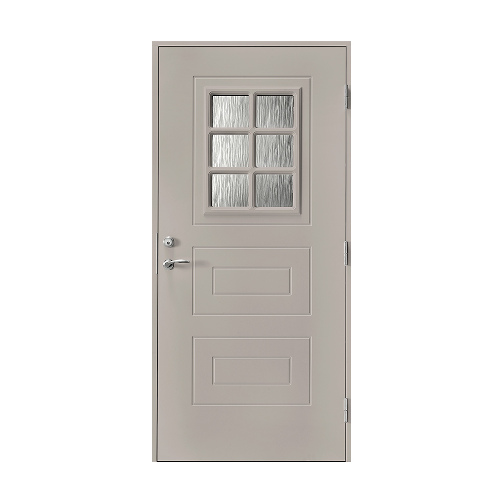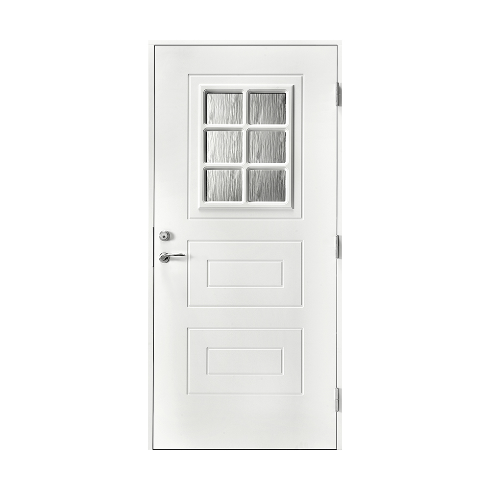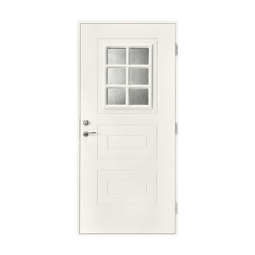 Åseda är en dörr i klassisk design. Ytterdörren har en fönsterruta med fast spröjs och klassisk dekor.