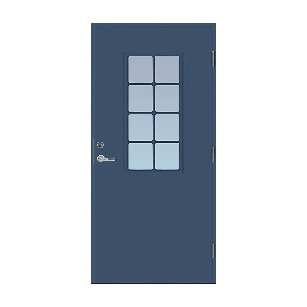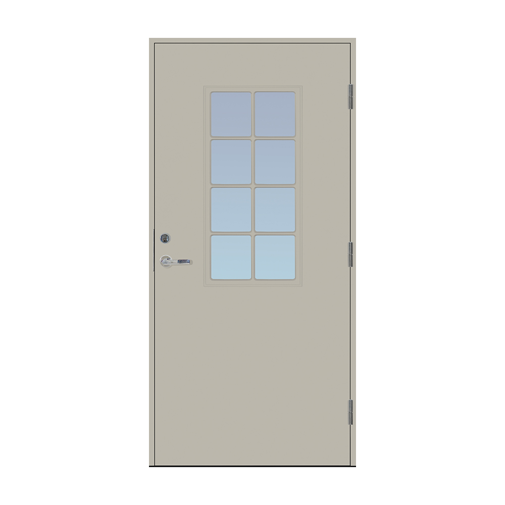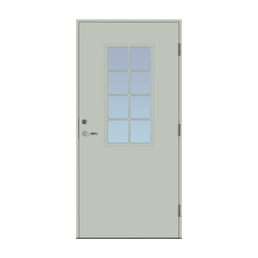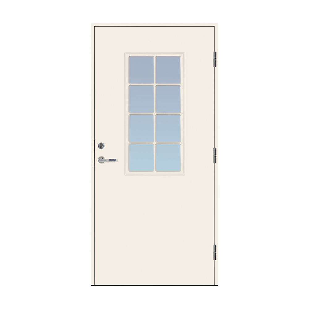 Dörrbladet har en slät insida, är 64 mm tjock och har 55 mm isolering samt två aluminiumplåtar som skyddar den inre konstruktionen.