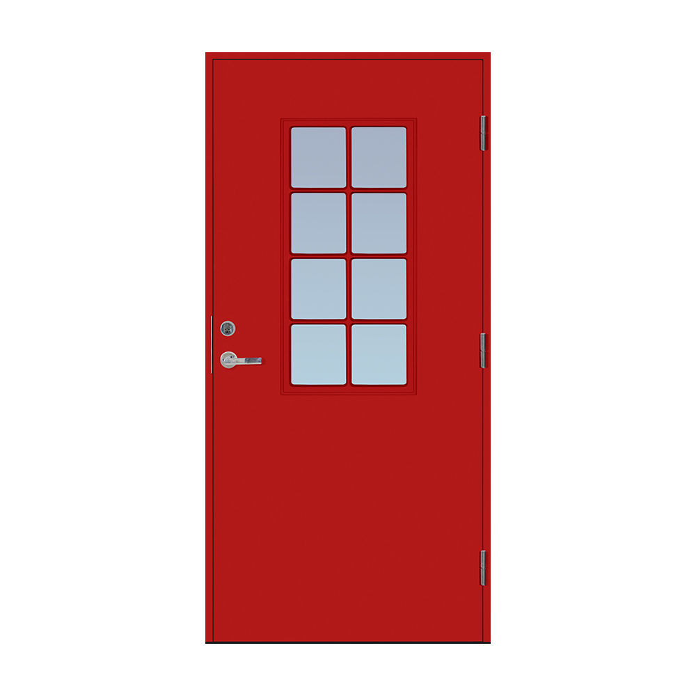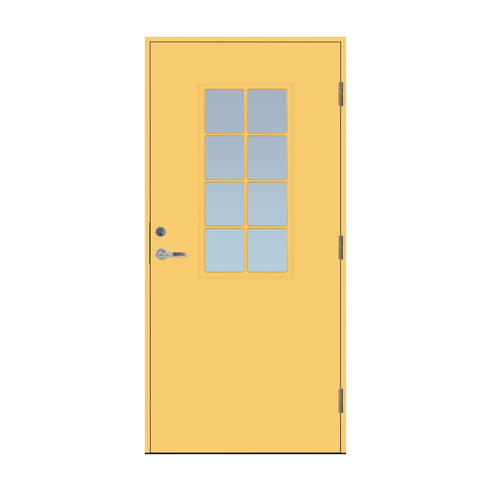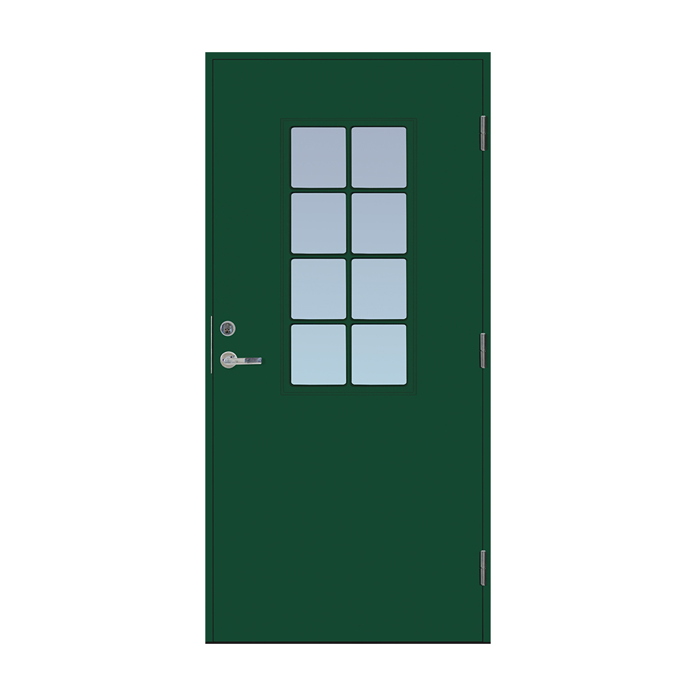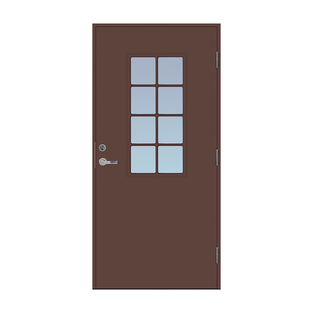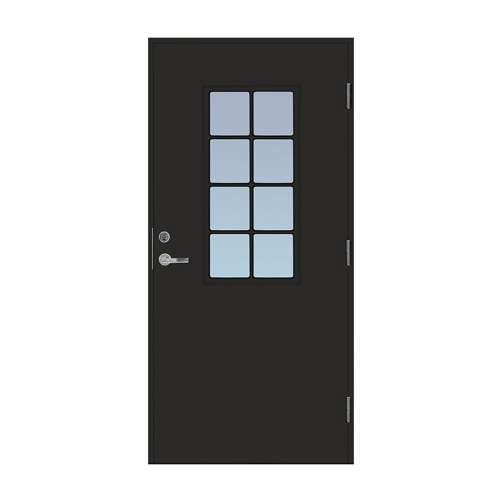 Dörrbladet har en slät insida, är 64 mm tjock och har 55 mm isolering samt två aluminiumplåtar som skyddar den inre konstruktionen.