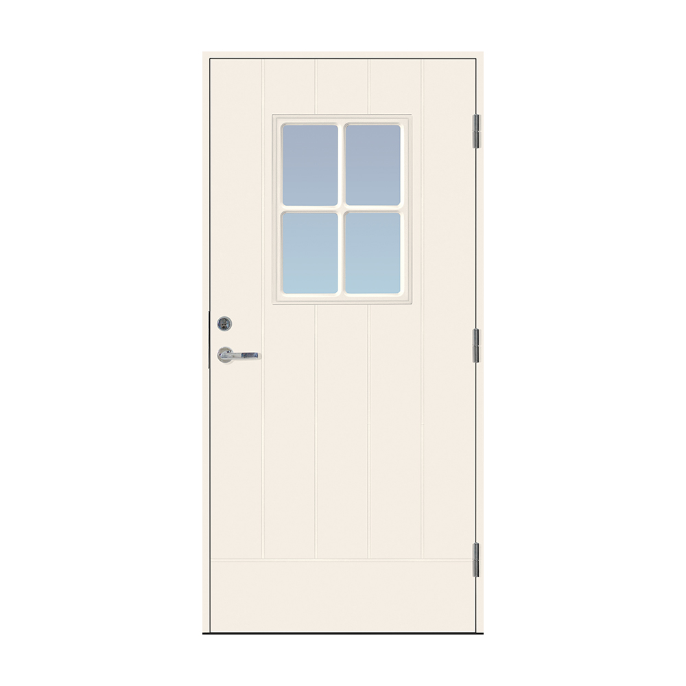 Dörrbladet har en slät insida, är 64 mm tjock och har 55 mm isolering samt två aluminiumplåtar som skyddar den inre konstruktionen.
