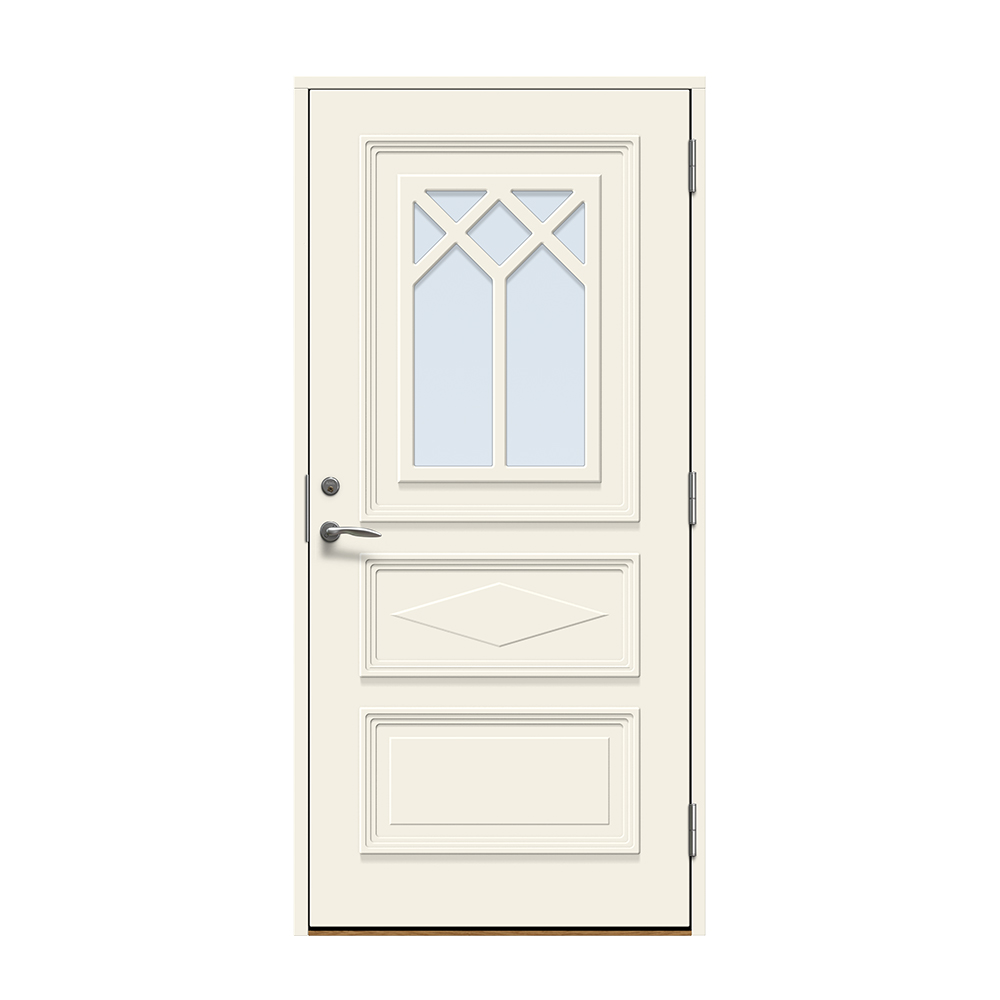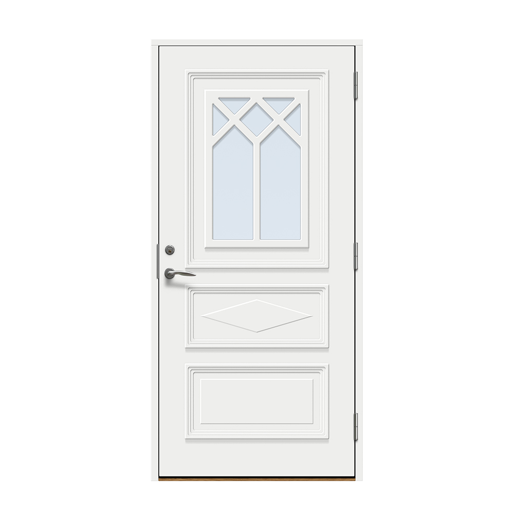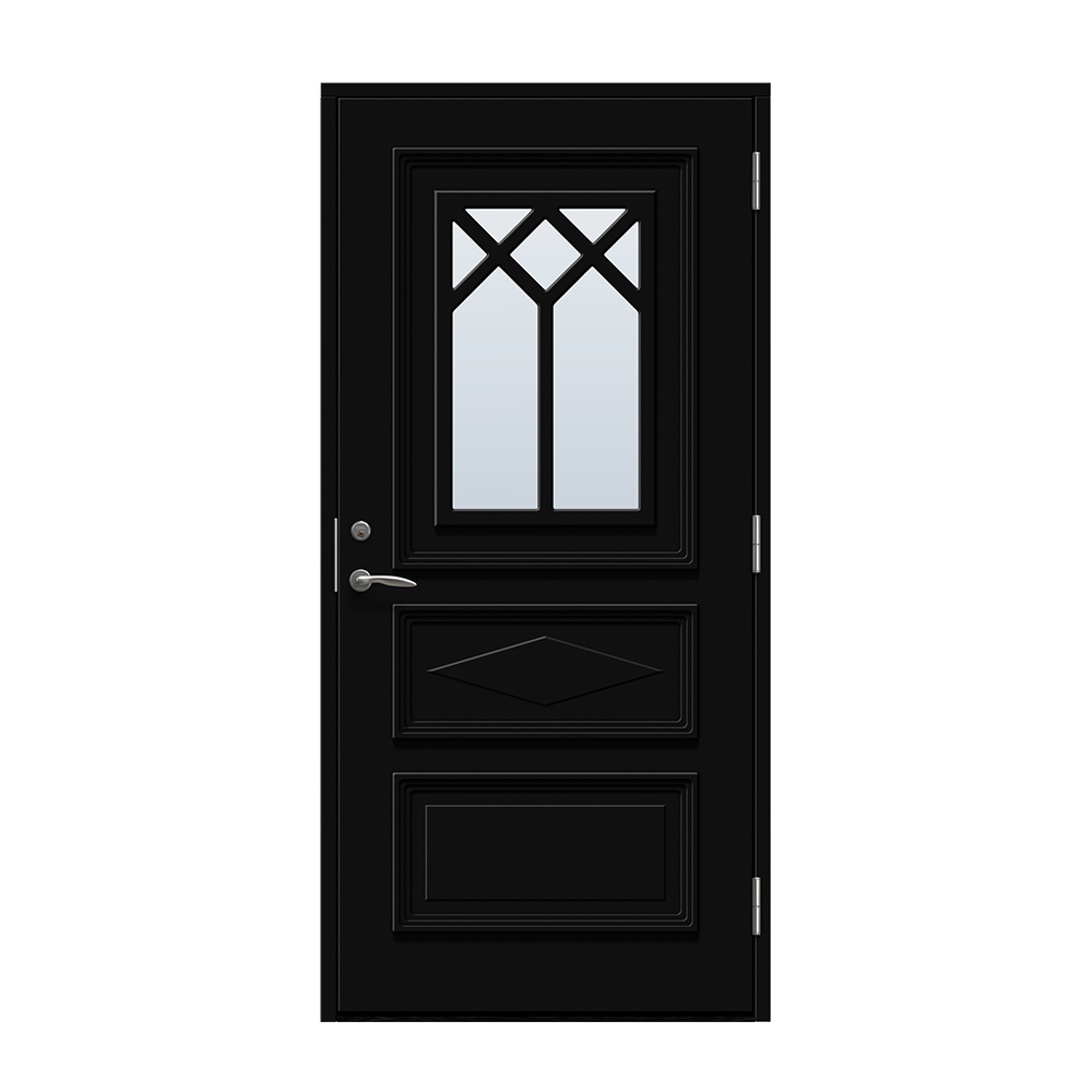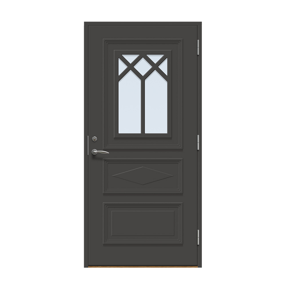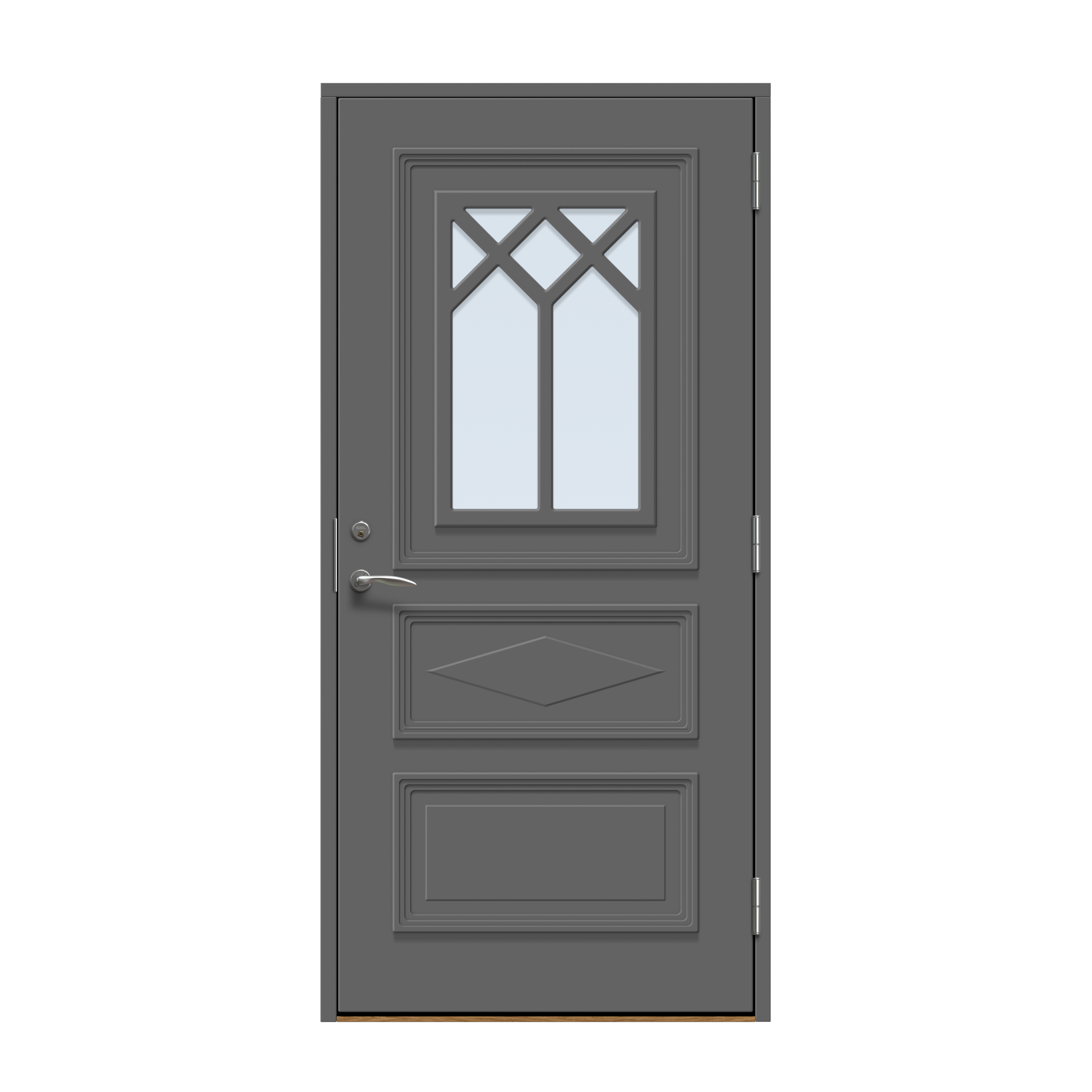 Pålsjö är en entrédörr med ett spröjsat fönster, snygga dekorer på utsidan och en slät insida.