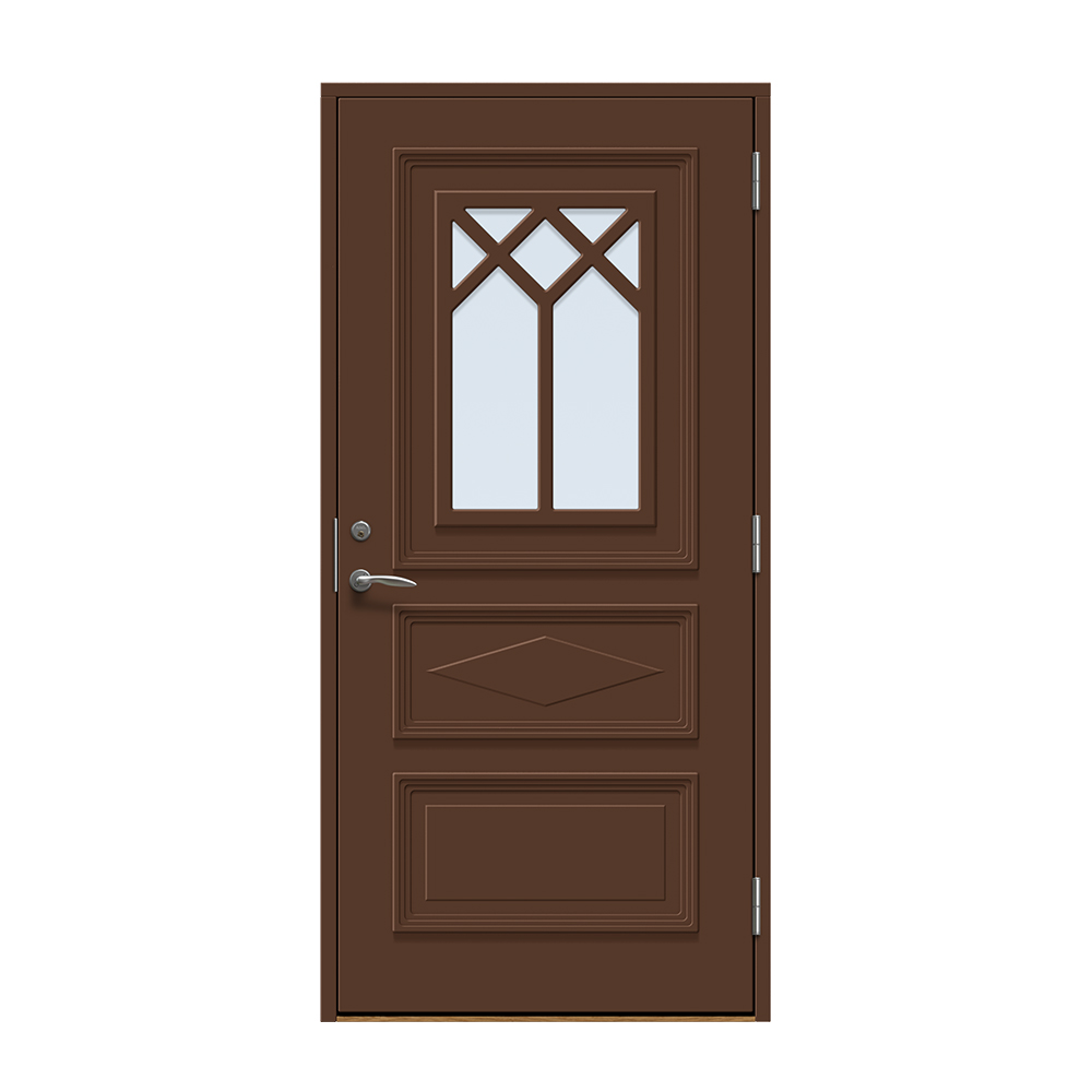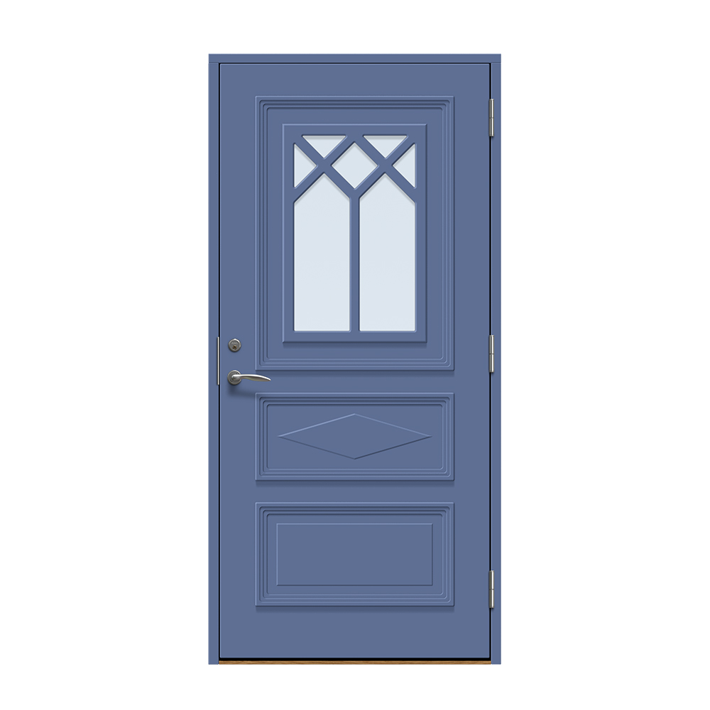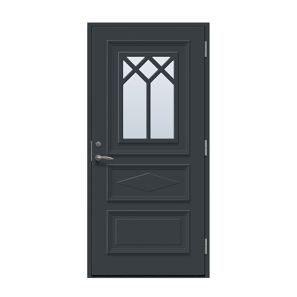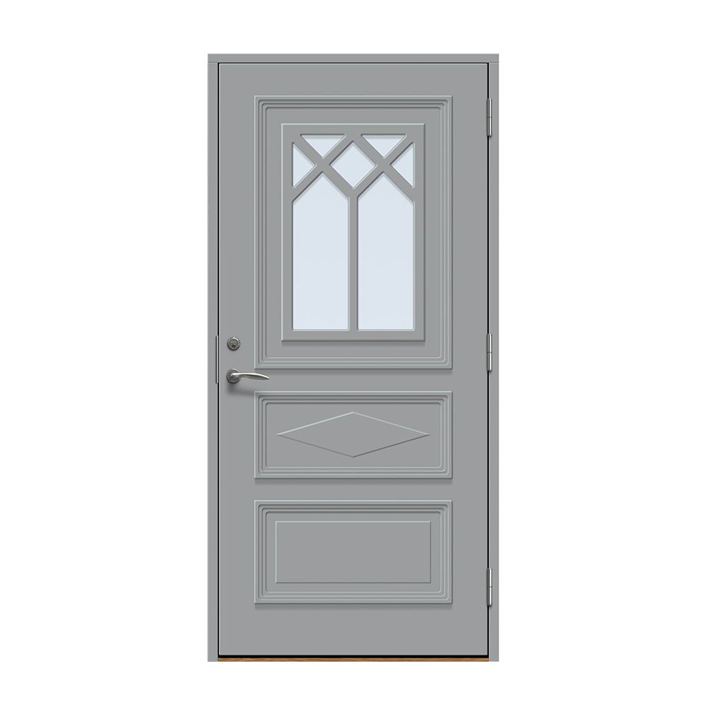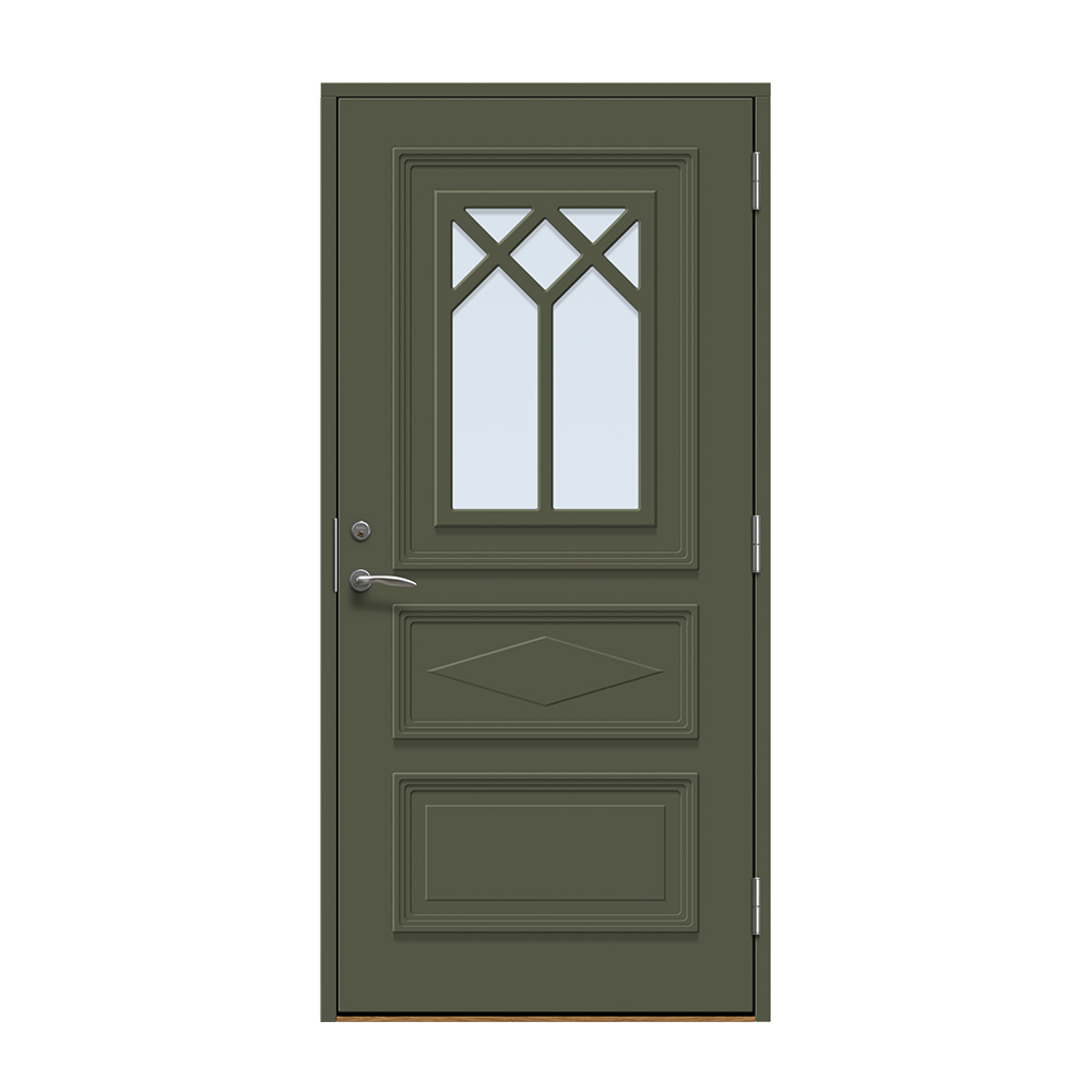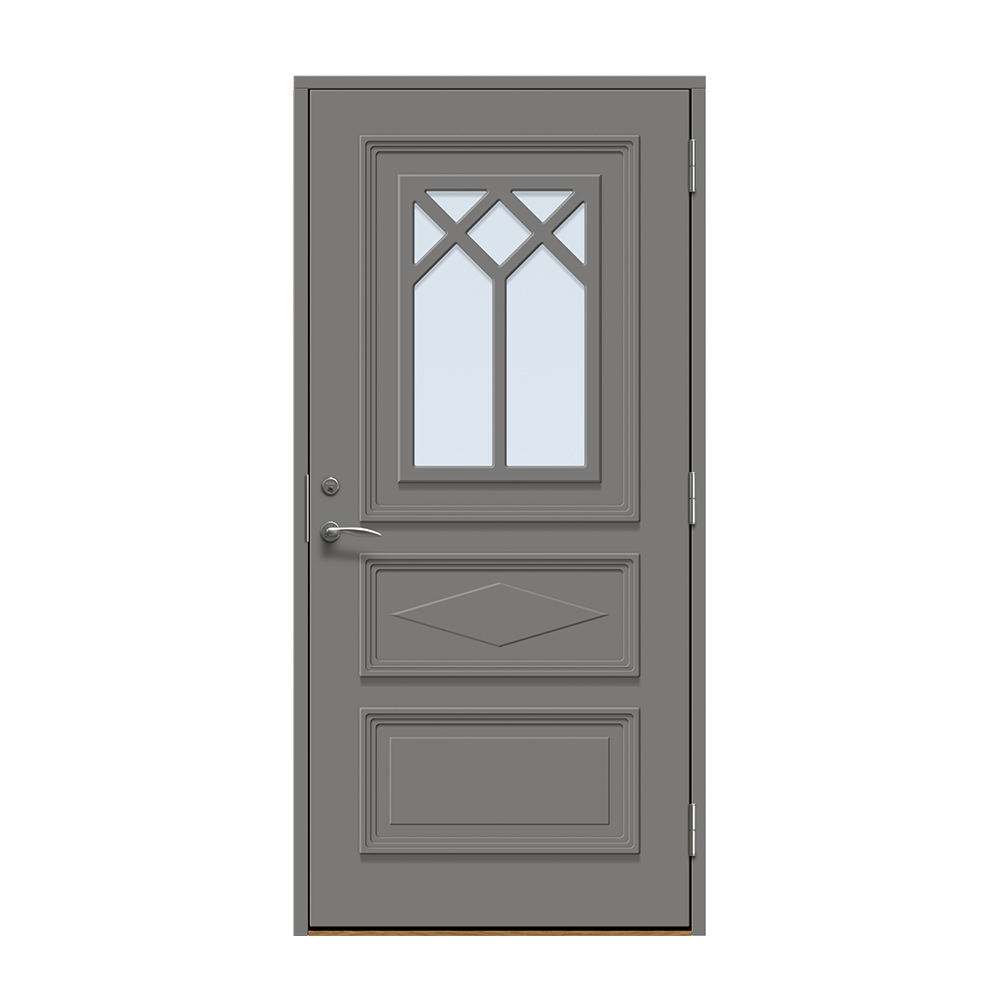 Pålsjö är en entrédörr med ett spröjsat fönster, snygga dekorer på utsidan och en slät insida.