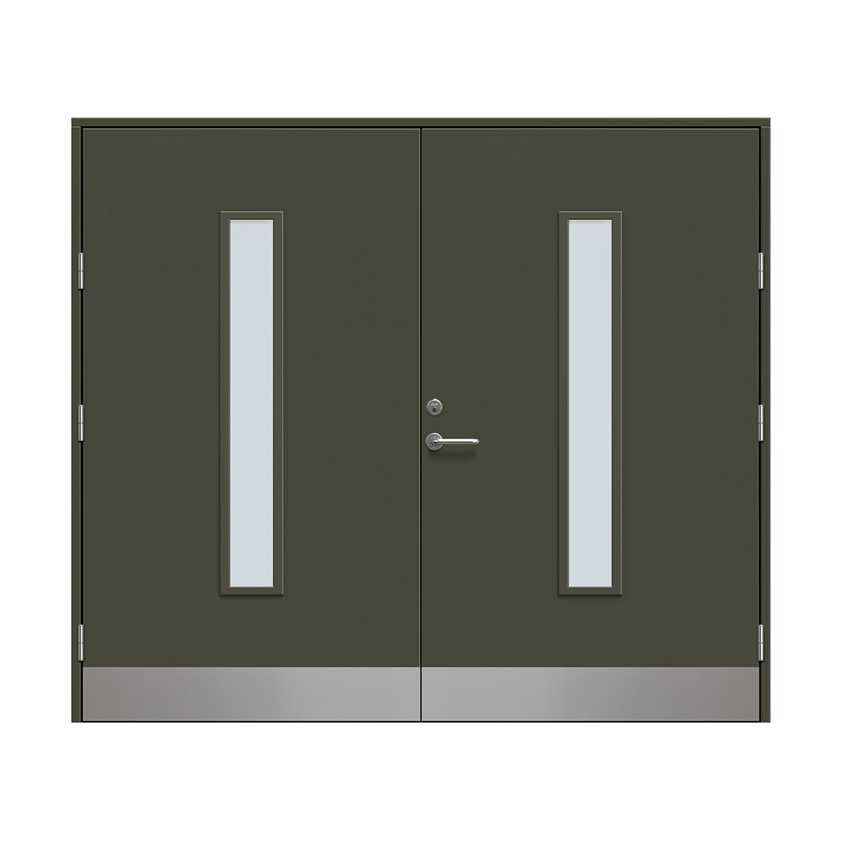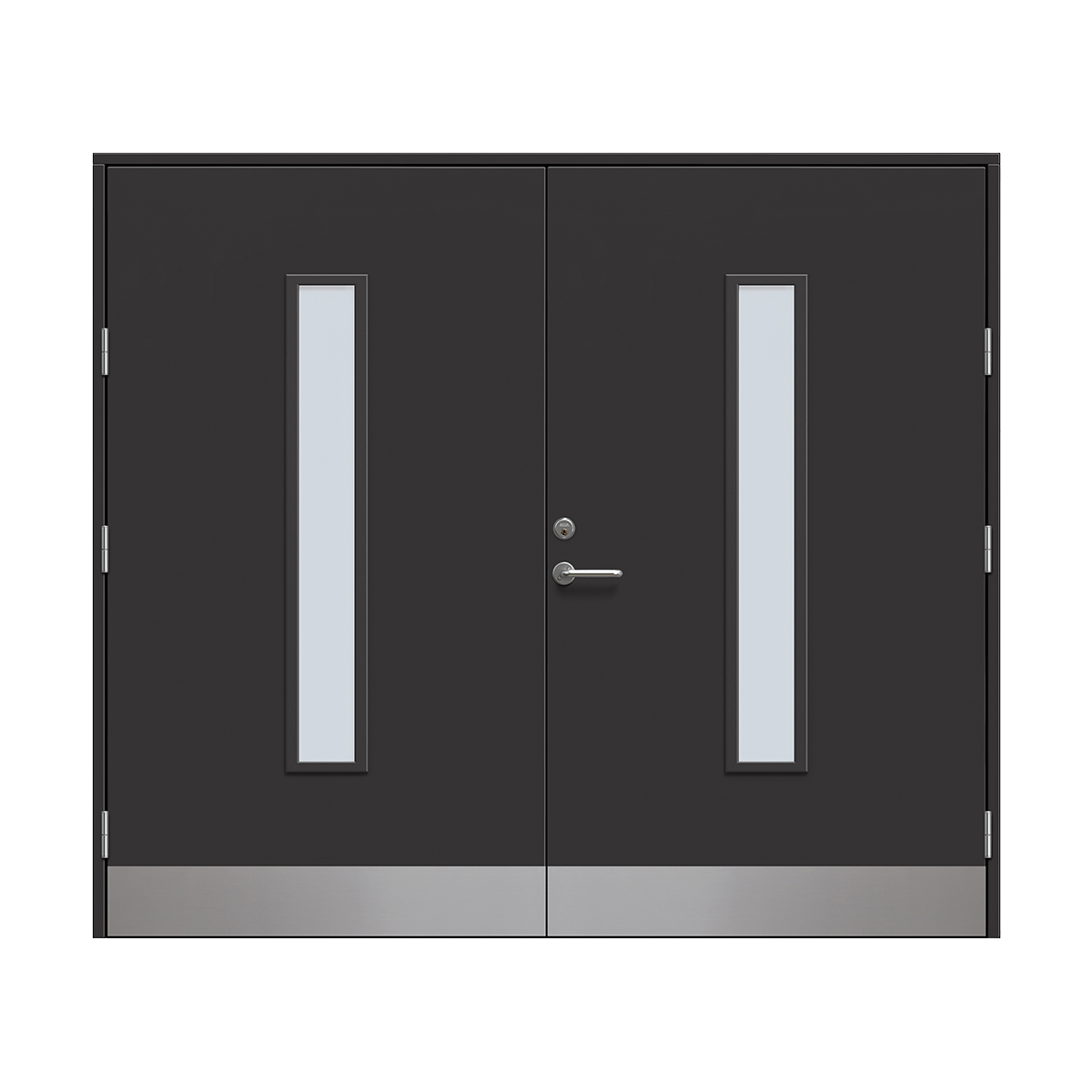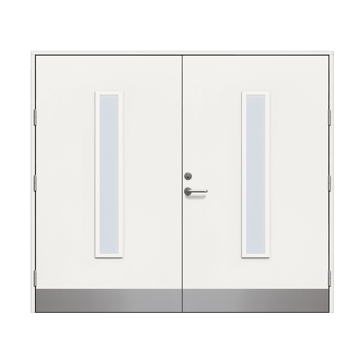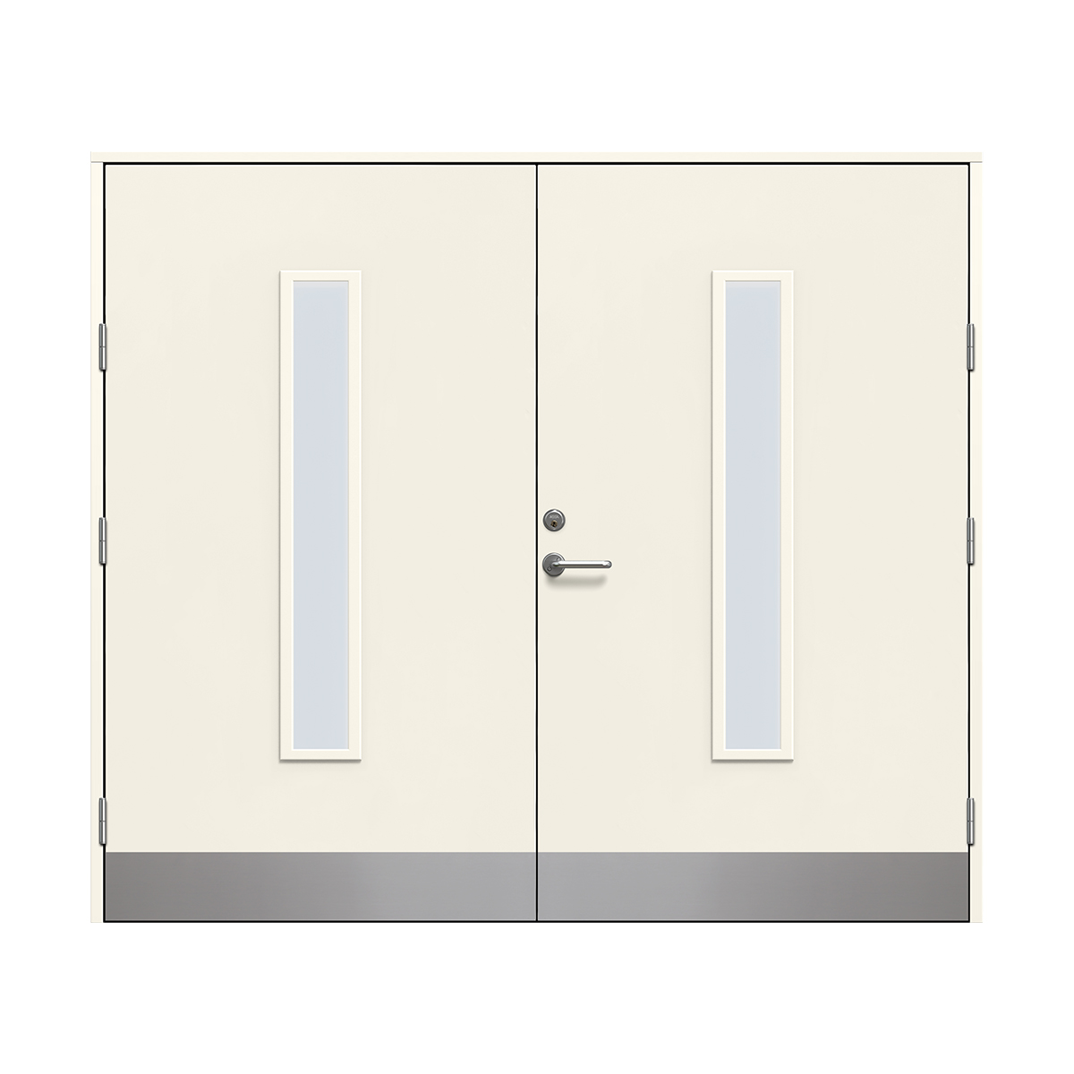 Det ingår inte något beslagspaket med dörrhandtag eller cylindrar till denna dörr utan det är något som du får köpa till. Du kan välja fritt mellan beslagspaketen som erbjuds, även Yale Doorman L3S passar.