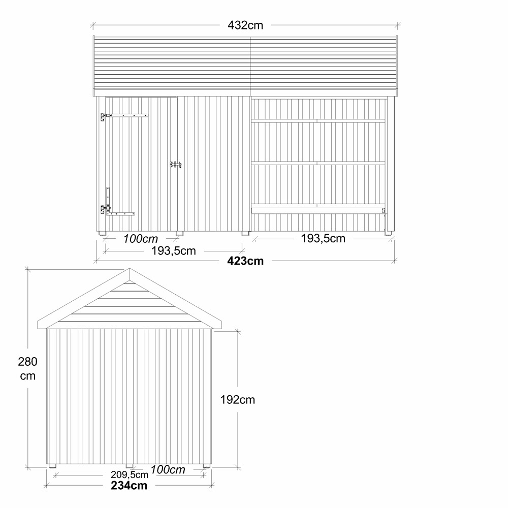 Här får du ett robust och rymligt trädgårdshus där den öppna delen passar för t.ex. ved, cyklar eller trädgårdsredskap, medan den stängda delen skyddar känsligare utrustning från väder och vind.