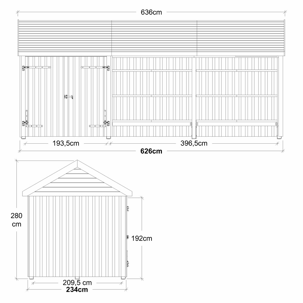 Det rymliga huset rymmer enkelt både redskap, cyklar och trädgårdsmaskiner – samtidigt som den öppna delen kan användas som en skyddad loungeplats eller ett extra utrymme för hobby och avkoppling.