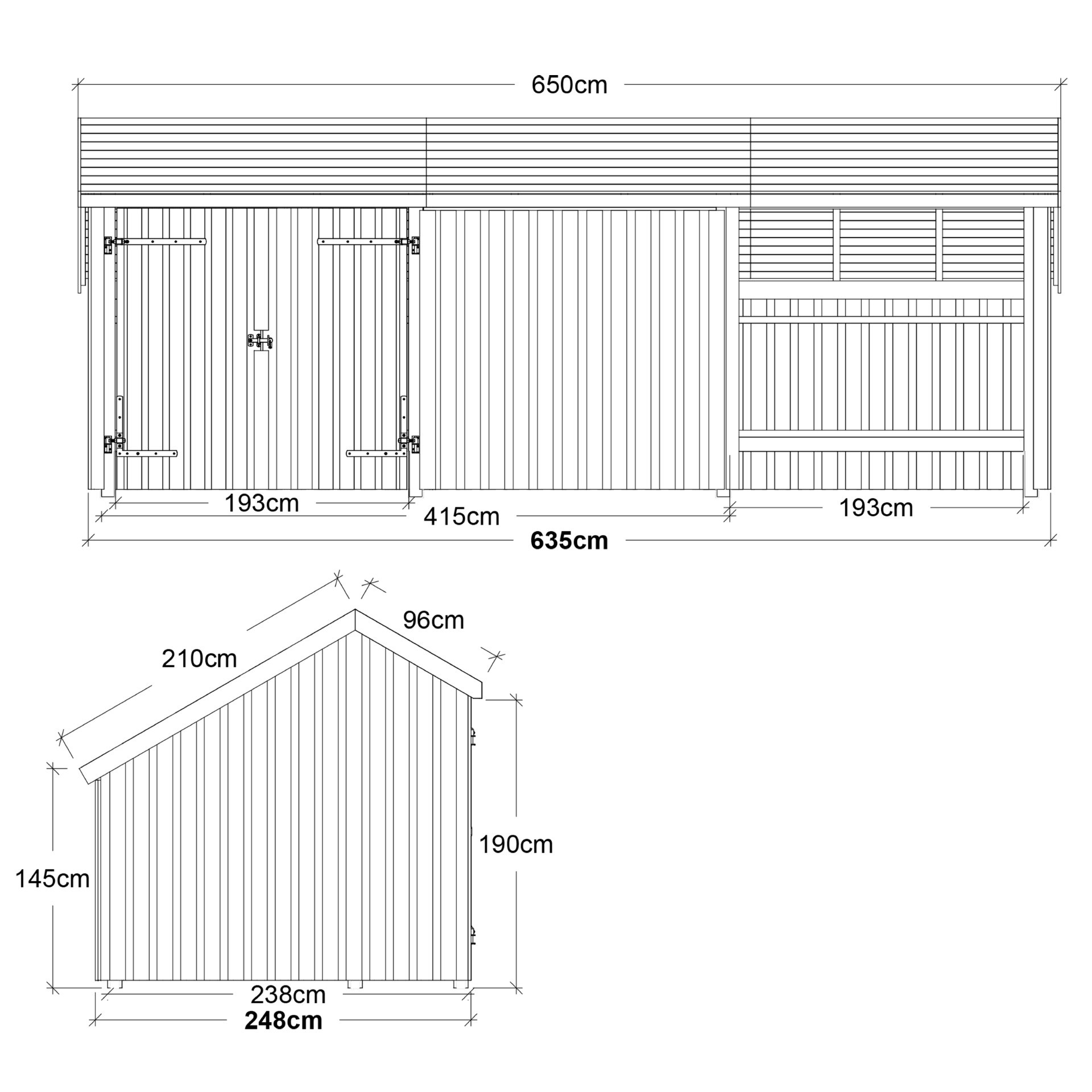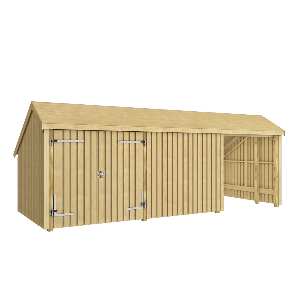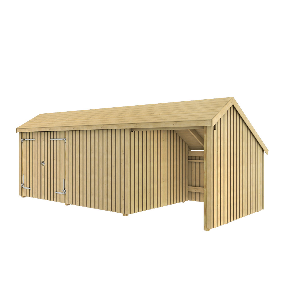 Multi trädgårdshus 15,5 m² är en flexibel lösning som ger dig både en rymlig förvaringsdel med dubbeldörr och ett öppet, täckt utrymme för avkoppling eller praktisk användning. Perfekt för dig som vill skapa struktur i trädgården utan att ge avkall på design och funktion.