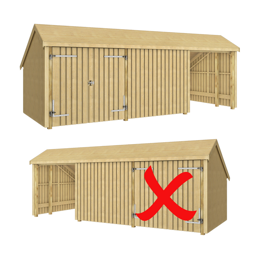 Tack vare den smarta konstruktionen kan du själv välja om dubbeldörren ska placeras till vänster eller höger, så huset passar just din tomt och användning.