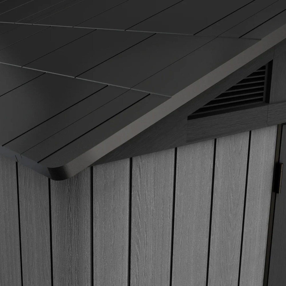 Förrådet är tillverkat i Evotech+™-komposit som ser ut och känns som trä, men kräver minimalt underhåll. Väggar och tak är förstärkta med stål och UV-stabiliserad resin som motstår sprickor, rost och röta.