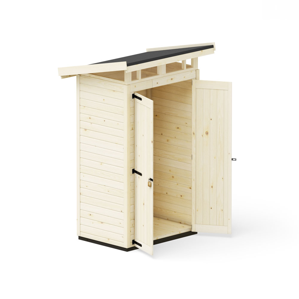 Tillverkat av FSC-certifierad nordisk gran och med en väggtjocklek på 15 mm är förrådet både robust och väderbeständigt. Taket är försett med slitstark takpapp för att skydda mot regn och snö. Den tryckimpregnerade basen förhindrar fukt från marken och skyddar dina saker året runt.