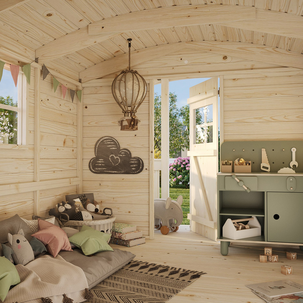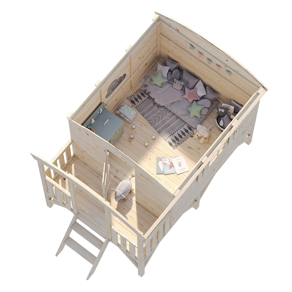 Lekstuga i gran upphöjd på stolpar för barn från 3 år och upp till 50 kilo. Max sex personer samtidigt. Lättmonterad med färdiga väggelement.
