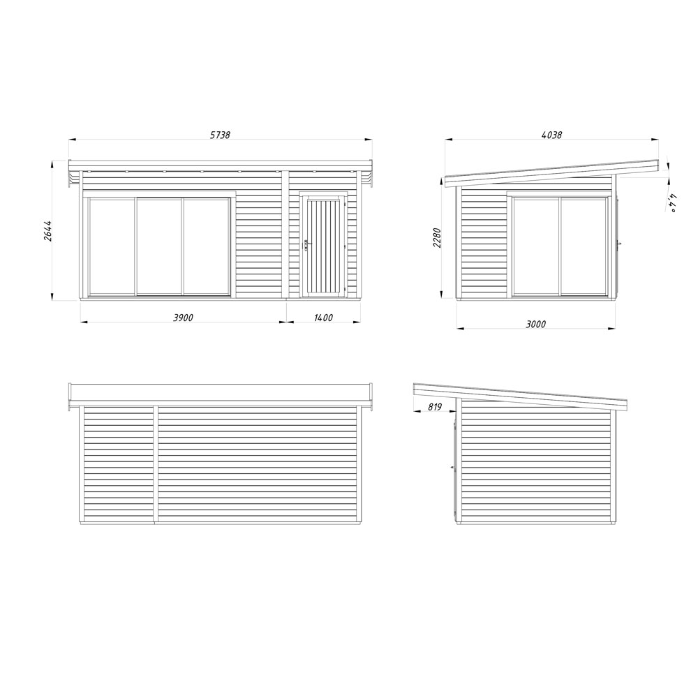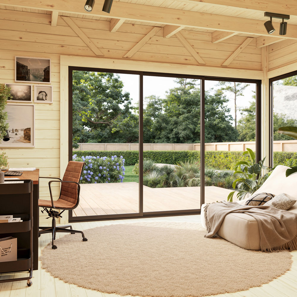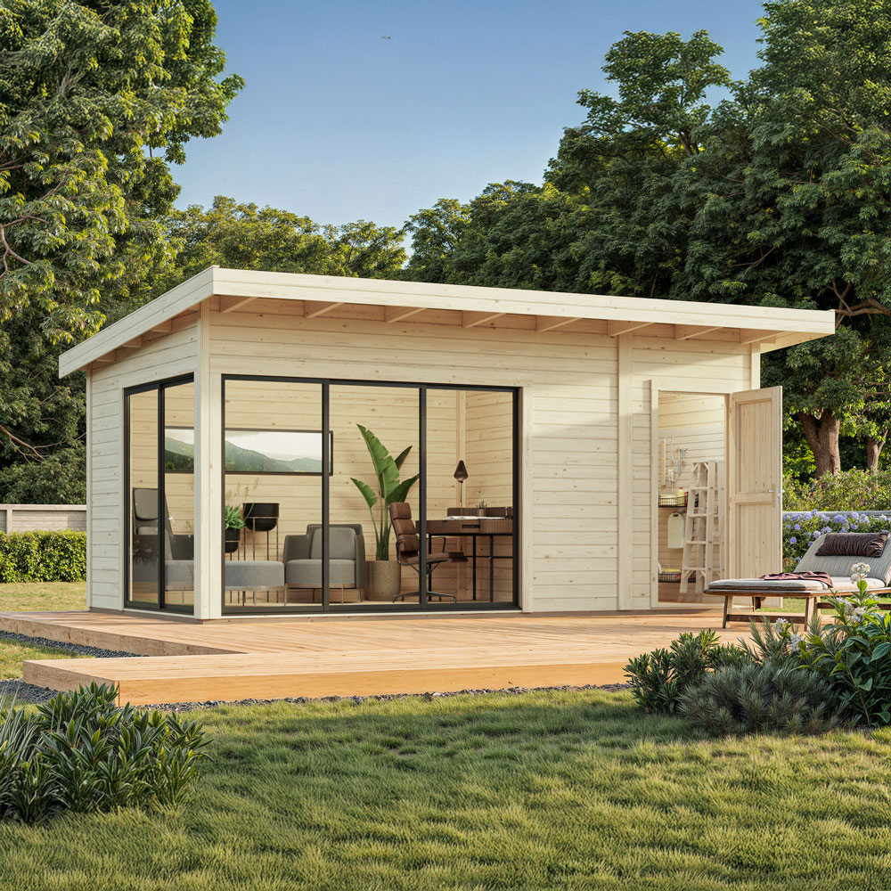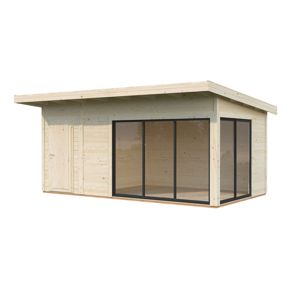 Andrea 15,9 m² Slide Plus är en modern och ljus trädgårdsbyggnad med stora skjutdörrar i aluminium och isolerande dubbelglas. Den breda glasfasaden gör rummet ljust och öppet och passar perfekt som hemmakontor, ateljé, gästrum eller ett extra uterum för avkoppling. Med robust konstruktion och modern design får du ett hållbart och användbart extrarum året runt – särskilt om du kompletterar med isolering.