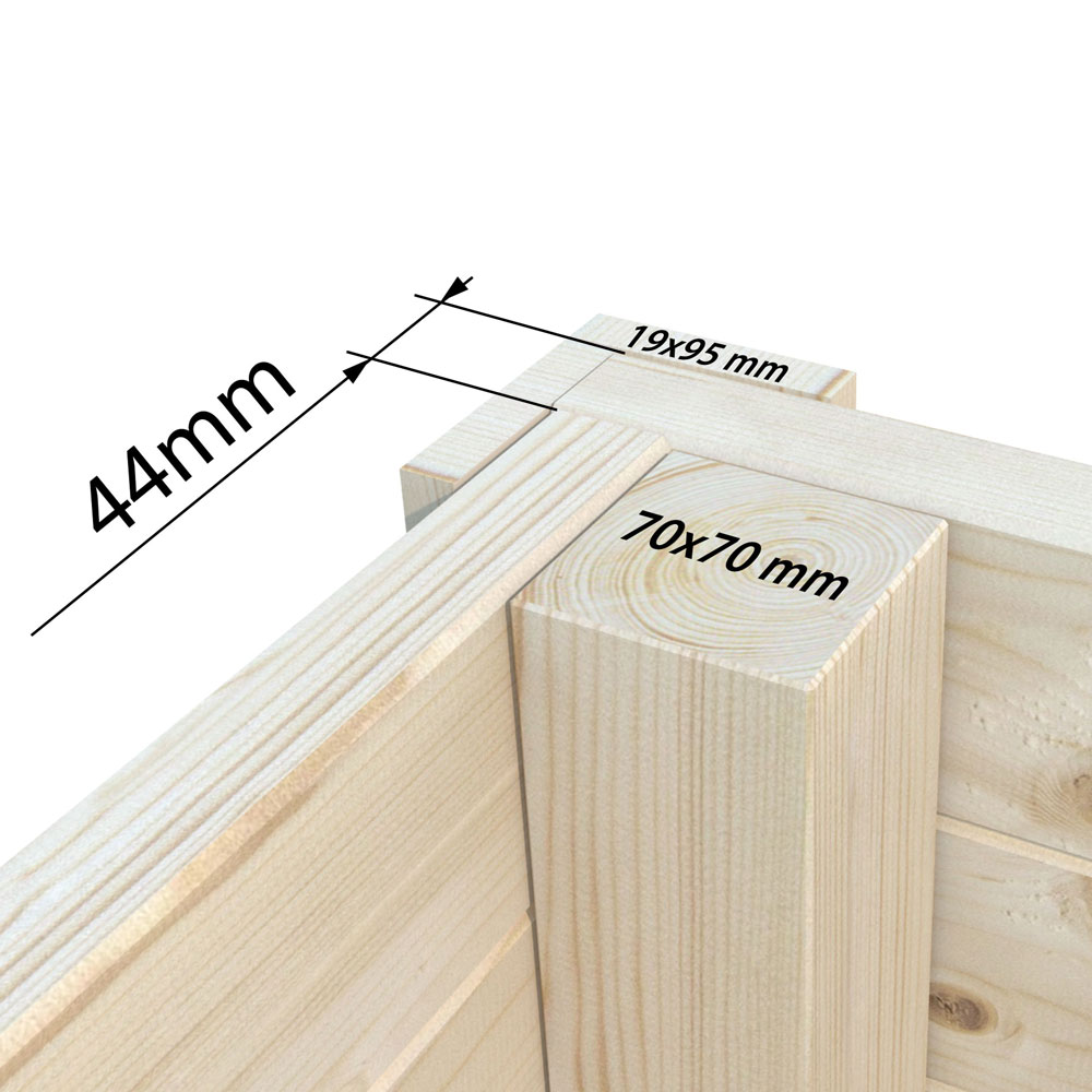 Stugan byggs i 44 mm spontat nordiskt gran, vilket ger en stabil konstruktion och goda förutsättningar för isolering. Väggmåttet är 530×300 cm och totalhöjden 264 cm. Taket är ett modernt pulpettak med 4,4° lutning och ett framåtvänt taköverhäng på 82 cm. Tak- och golvbrädor levereras i 19 mm massivt trä.