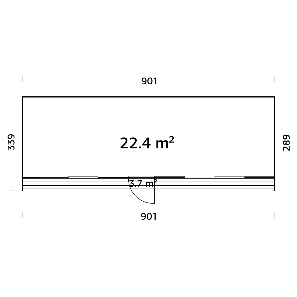 Byggnaden mäter 901×339 cm och har en vägghöjd på 276 cm, vilket skapar en rymlig interiör. Totalhöjden är 296 cm. Det flacka pulpettaket har en lutning på 3° och en toplamarea på 31,0 m², byggd med 19 mm spontade takbrädor. Golvbrädorna är också 19 mm, vilket ger ett stabilt och slitstarkt golv.