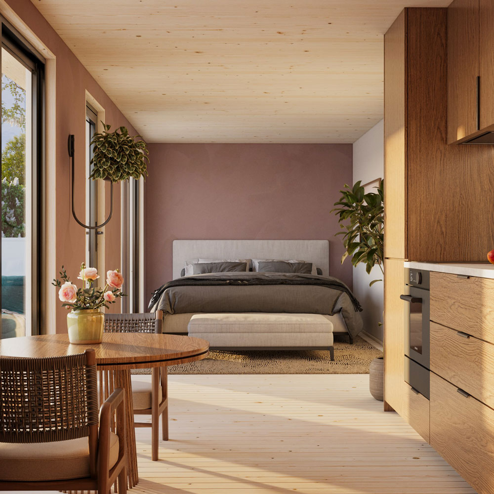 Johanna 30,6 m² är en modern och ljus trädgårdsbyggnad med höga väggar, stora glasade dörrar och en flexibel planlösning som passar både som gästrum, hemmakontor eller kreativ ateljé. Den breda fasaden och den öppna interiören ger ett luftigt intryck och gör byggnaden enkel att inreda efter behov.