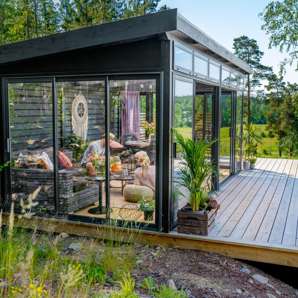 Gäller vid köp av uterumspaket med uterumspartier, kanalplasttak och limträstomme till och med 13 april. Gäller ej Fix sommaruterum.Förstärk utekänslan och gör ditt rum mer öppet och ljust med ett glastak. Önska uterum är fristående, kan placeras var du vill på tomten (sålänge du följer gällande regler) och har många användningsområden. Förutom att du kan skapa den perfekta platsen för umgänge väljer många att ha det som t.ex. ett poolrum. Men vi har även sett det användas som både ateljé och yogastudio. Det bakåtlutande taket och den extra fönsterraden gör att du får en härlig rymd och ett fantastiskt ljusinsläpp.