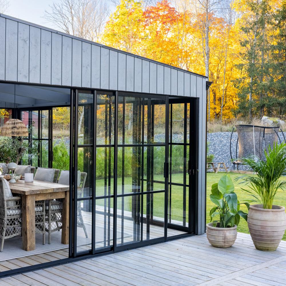 Ditt uterum levereras med högkvalitativa skjutdörrspartier med säkerhetsglas, anpassade efter den säsong du valt. Profilerna är snyggt designade i underhållsfritt aluminium och kan fås i olika kulörer. Våra egendesignade uterumspartier är svensktillverkade och håller mycket hög standard.