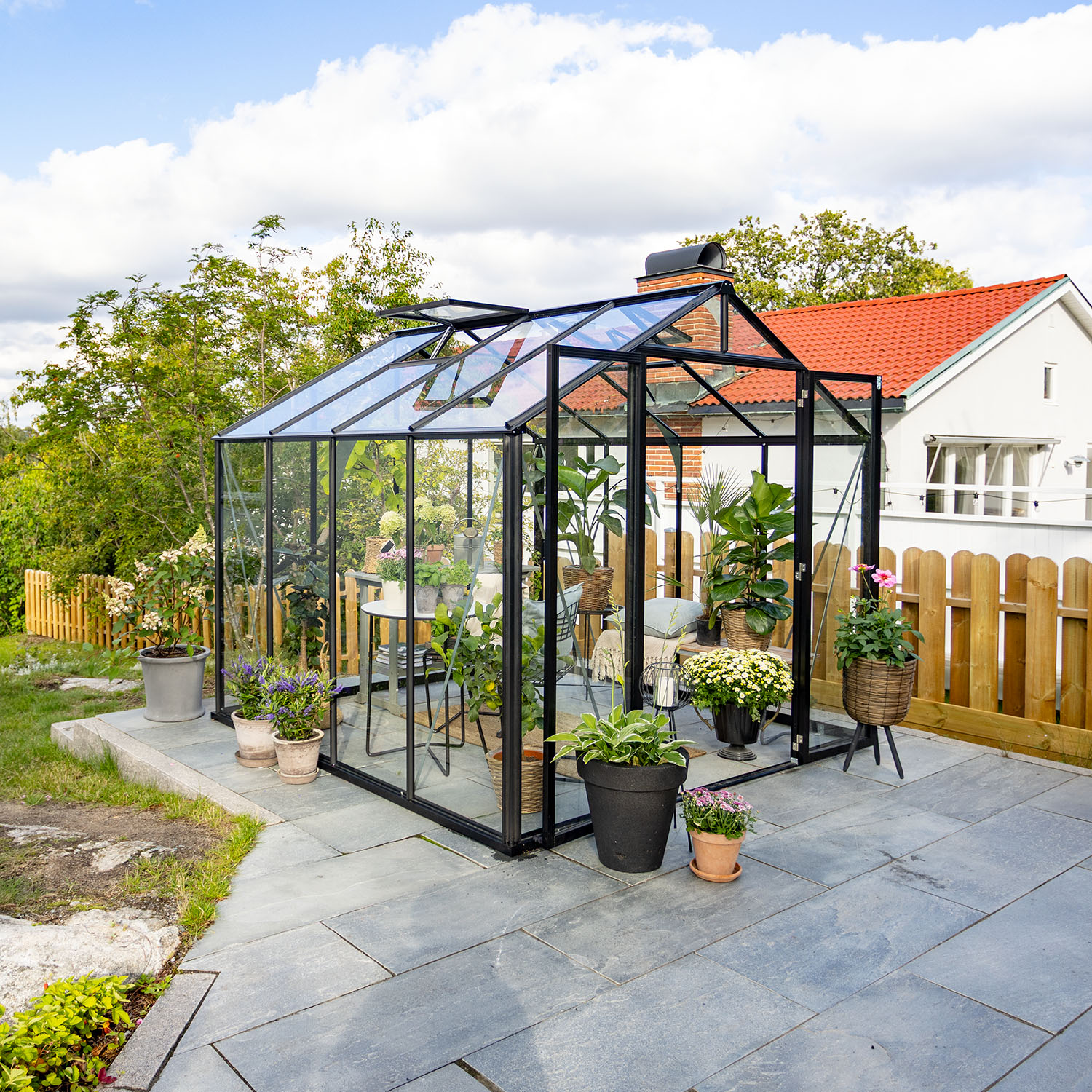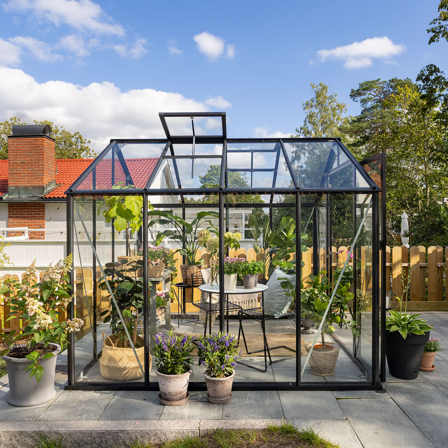 Med sitt moderna formspråk och smarta konstruktion är Olivia ett växthus som kombinerar design och funktion på bästa sätt. Den flacka takvinkeln ger växthuset ett stilrent uttryck, medan den helglasade gaveln – från mark till nock – skapar ett fantastiskt ljusinsläpp och en känsla av att vara ute, även när du är inne.