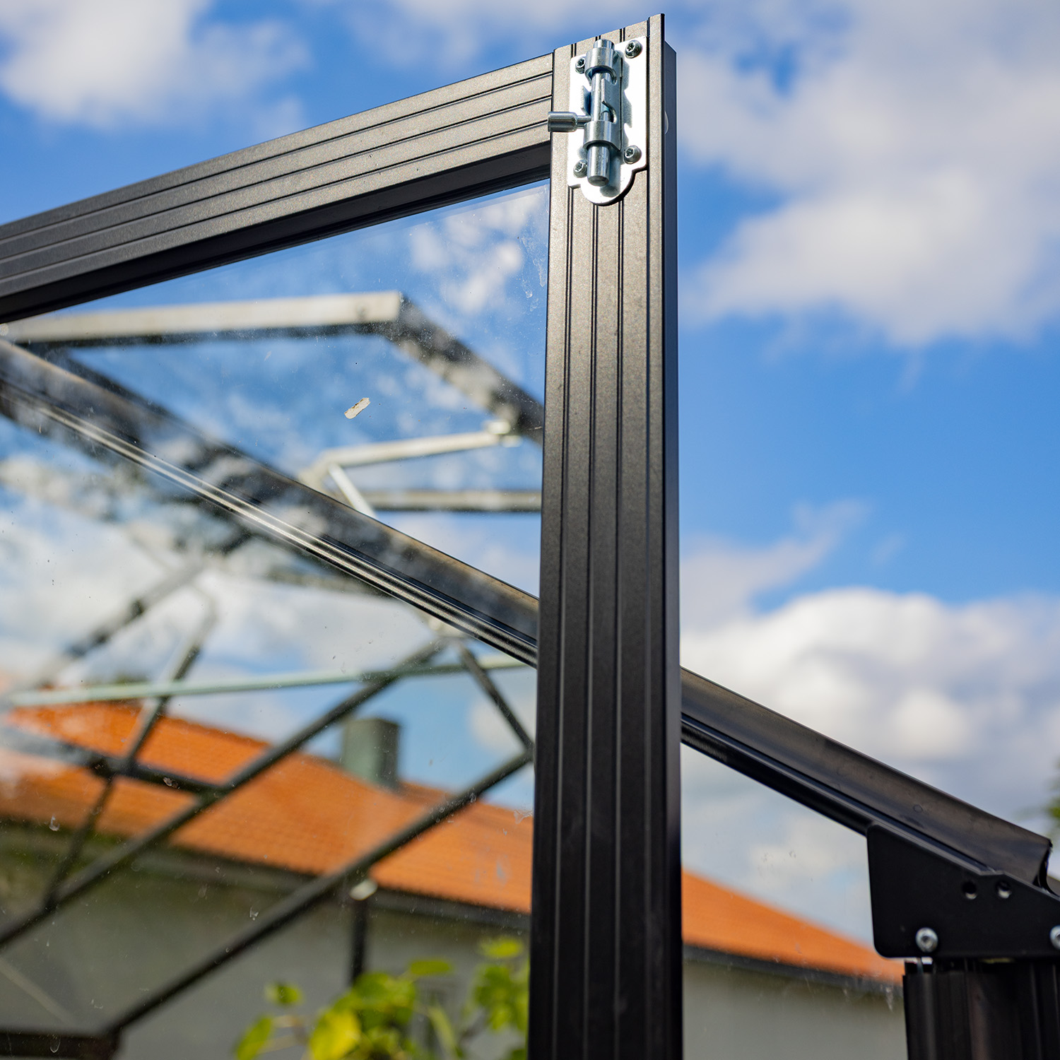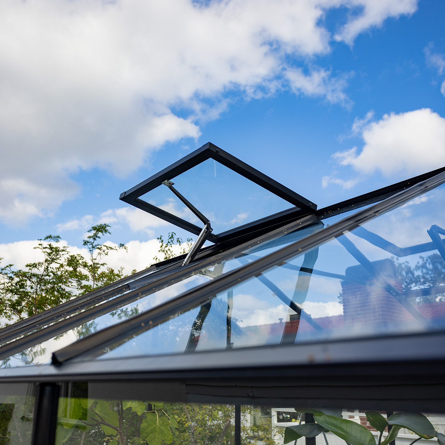 För att göra det enkelt att komma igång levereras Olivia med flera funktioner redan från början. Ett öppningsbart takfönster ingår i alla storlekar för god ventilation. Den integrerade sockeln ger extra stabilitet och förenklar monteringen, och de specialdesignade gummilisterna håller glaset stadigt på plats – för en tystare och tryggare konstruktion. Även dörrhållare/dörrstopp ingår till båda dörrarna för säker och enkel användning.
