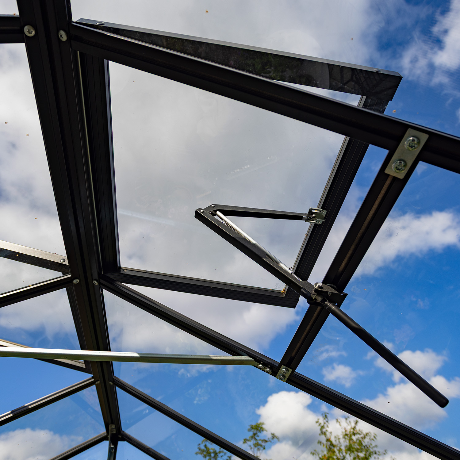 Dessutom kan du göra växthuset ännu mer personligt med tillbehör som hyllor, automatisk fönsteröppnare och upphängningar för dina växter. Markinfästning ingår inte utan köps separat beroende på vilket underlag du har. Välj mellan vinkeljärn eller nedgjutningsjärn.
